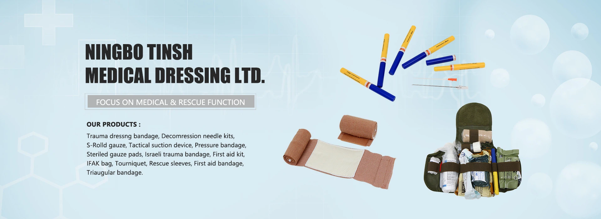 Ningbo Tinsh Medical Dressing Ltd. was established in 2002. Most of our products are for export for medical and rescue function. We began to supply to U.S. military contractor from year 2006. We often develop a product together with the contractor. Ningbo Tinsh Medical Dressing Ltd. is specialized in manufacturing and exporting kinds of products for medical and rescue use including military fight, outdoor, etc. We have more than 19 years export to U.S. market for military contractor, Rescue/emergency trauma department and hospital.